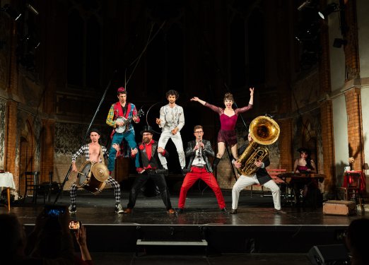 Klezmer-Musik in der Manege! Die legendäre Klezmer-Band Dobranotch macht Klezmer-Zirkus auf der Bühne! Die Verbindung dieser Traditionen verspricht TSUZAMEN ganz viel jiddischen Humor und pure Energie! Hier wimmelt es nur so vor Migrationshintergründen und die gesamte Performance handelt von Bewegung, Exil, kulturellen Wurzeln und menschlicher Verbindung. Das Publikum erlebt poetische und humorvolle Szenen, traditionelle jiddische Melodien, Tanz, Pantomime sowie Nummern mit Bodenakrobatik und Einrad. Eine farbenreiche, lebendige Feier von Musik, Vielfalt und Lebensfreude. Mitia Khramtsov Violine, Gesang // Jack Butler Tuba, Trompete, Posaune, Einrad // Ilia Gindin Klarinette, Saxophon // Paul Milmeister Banjo, Grammophon, Clown // Evgenii Lizin Große Trommel // Sam Gurwitt Bodenakrobatik, Clown, Violine // Germina Gordienko Tsimbl